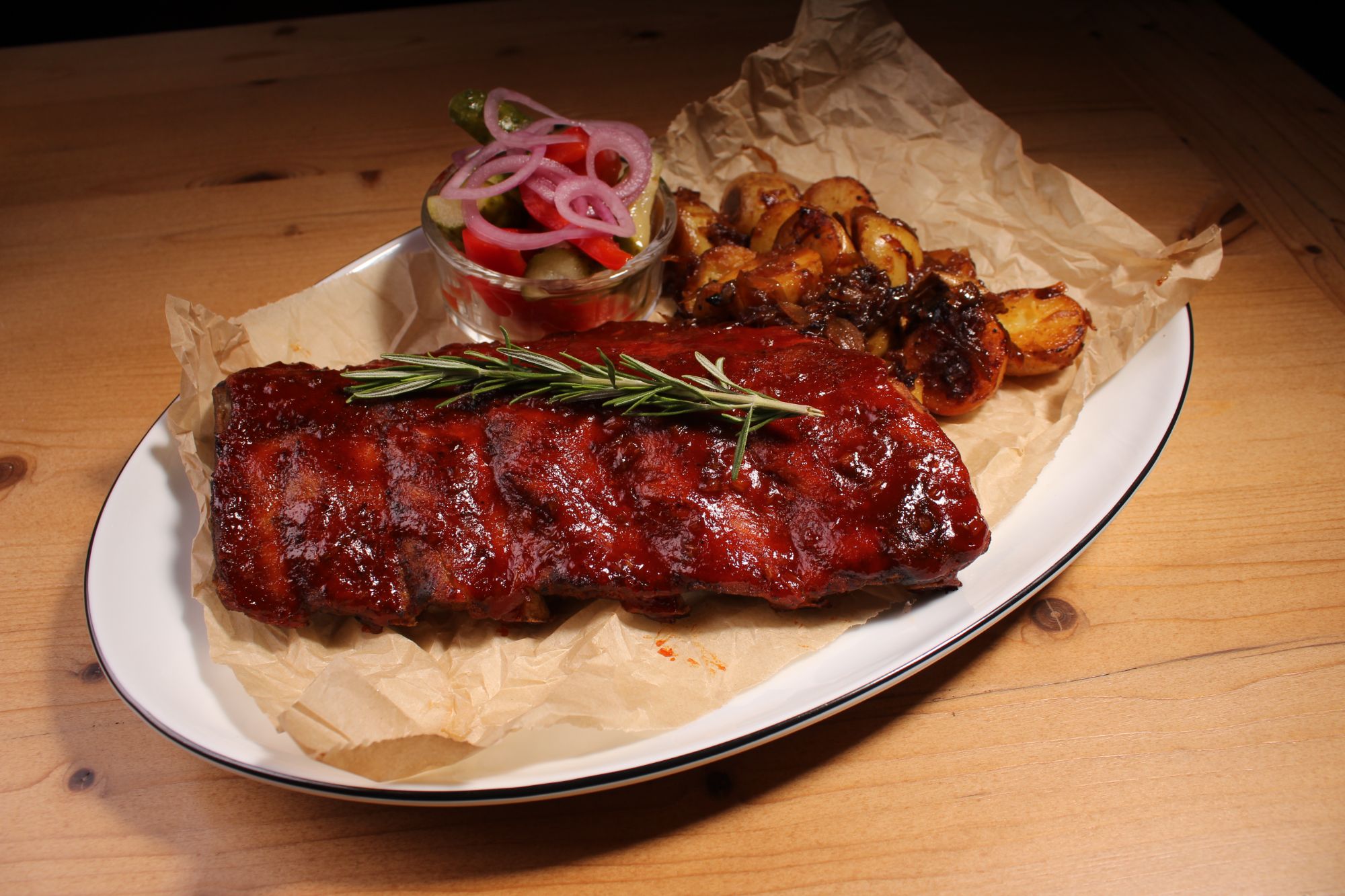 Serwowany z puree ziemniaczanym oraz piklowanymi ogórkami z papryką.